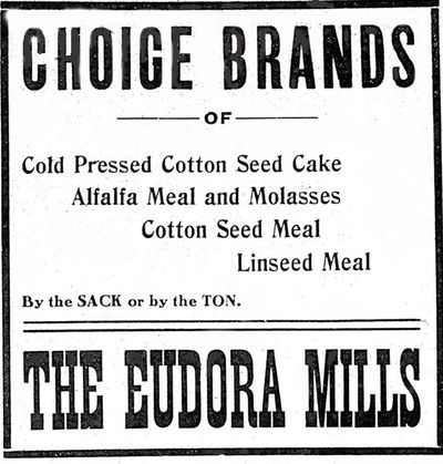 When the Betts sold Eudora Home Bakery in 1922, it went through several owners in a short time. Bill Willey, who bought the bakery, promoted his cinnamon rolls, raisin bread, doughnuts, sugar cookies, Scotch cookies, fruit bars, lemon snaps, fruit pies, and lemon and cream pies on the weekend. Other businesses of the decade were: Eudora Department Store (which also sold groceries including its specialty of smoked fish); Eudora Mill and Elevator; Farmers Union Co-operative Elevator (managed by W. E. Meltzer); Co-operative Dairy Association; Edelbrock’s garage; J. W. Combest grocery; H. H. Hagenbuch and Son meat market and ice plant; Tarleton Confectionary; Daugherty Meat Market (“Weep and you weep alone, Laugh and we know you buy your meat at Daugherty’s Cash Market”); Charles Pilla Department Store and grocery; Eudora Cleaners and Dyers (above the newspaper office); Eudora Hardware; Lothholz Lumber (“Good grades, honest count, and square dealing― Lothholz Lumber”); W. H. Ziesenis Confectionary; State Bank of Eudora (“$20,000 capitol and surplus”); Eudora Produce; Harvey Eating House; and Eisele & Gabriel who sold Rumely tractors and did plumbing, wiring, tin, and sheet metal work.