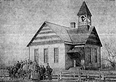 Farmland No. 71 (1870-1955). The widow of Robert Peebles deeded in 1870 an acre of land at the southwest corner of Section 31 Township 12 Range 21 for a 30-foot by 40-foot schoolhouse of soft bricks. It had four windows on each side and a door in the south. A blackboard extended across the north wall. Two cloak rooms at the front entrance partitioned the entry from the main school room. The partition was eight-feet high so that heat from the pot-bellied stove could pass over and warm the coats and keep the dinner bucket contents from freezing.